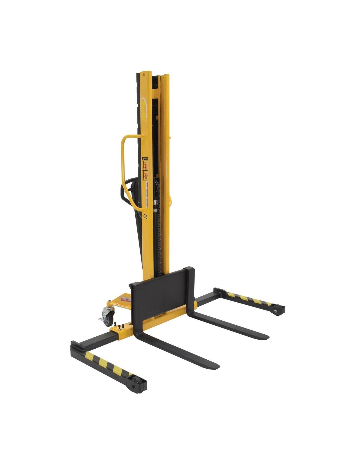 Manual Hydraulic Hand Pump Stackers are sturdy and compact to fit through most standard doors. Forks are raised by manual hydraulic hand pump operation and released by a lever situated on the handle. 3/4" lift per handle pump. NM stands for narrow mast.