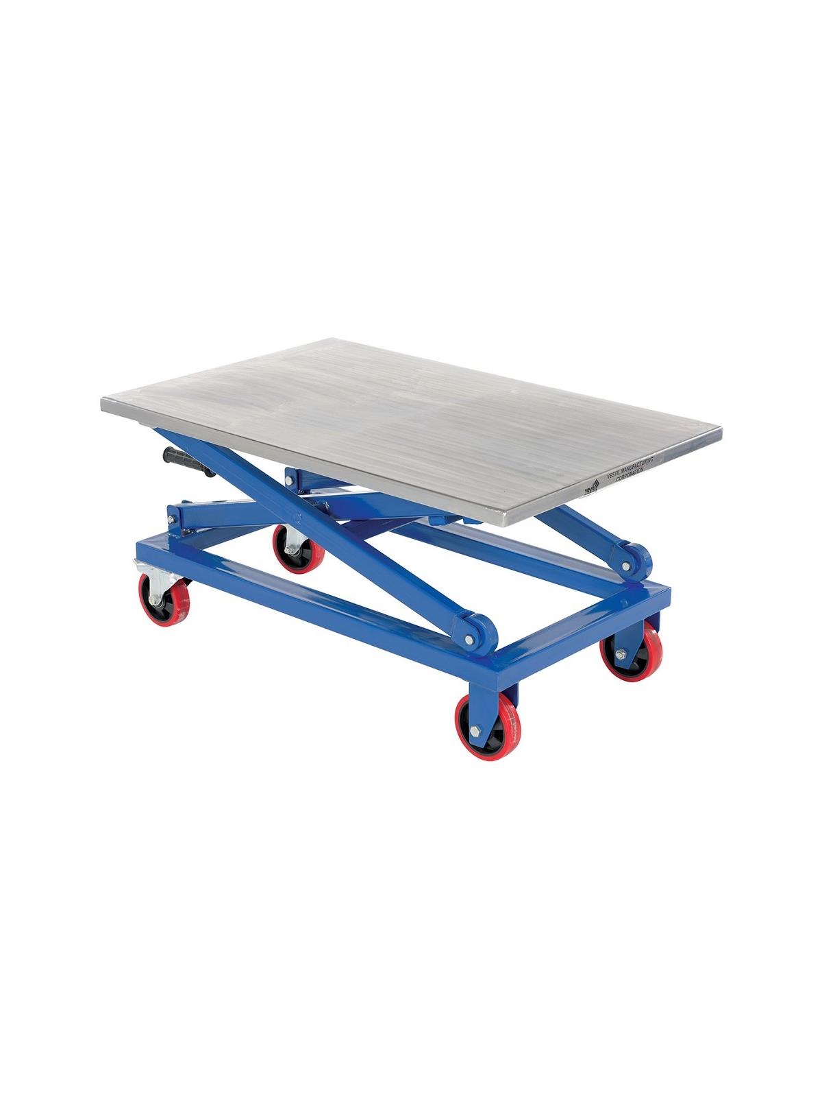 Raise and lower material quickly and easily with Mechanical Scissor Carts. Carts roll smoothly on two rigid and two swivel poly-on-poly caster. Mechanical screw drive provides precise positioning with no downward drift. The partially stainless steel cart features a stainless steel platform. Frame, handle, caster rigs and hardware are zinc plated. Crank assembly and scissor legs are painted. FOB Shipping Point.