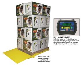 The Mild Steel Pallet Floor Scale is finished with a durable, non-slip, safety yellow powder coat paint that is easy for forklift operators to see, even in low-light warehouse environments. The scale is constructed of durable Type A36 carbon steel and has a unique multi-ribbed understructure support design. Top access leveling with built-in bubble level. 1/4" thick deck plate with lifting eyebolts. Comes with safety tread deck. Features 1" backlit LCD display. ABS, Black NEMA 12 or SS NEMA 4X enclosure. Includes 25' cable, FB1200 instrument, wall-mounting bracket, quick disconnect and factory calibration. Scale and instrument are "Legal for Trade" in the U.S. and Canada. Legal for Trade approval is contingent upon installation completed by a certified scale technician. FOB Shipping Point.