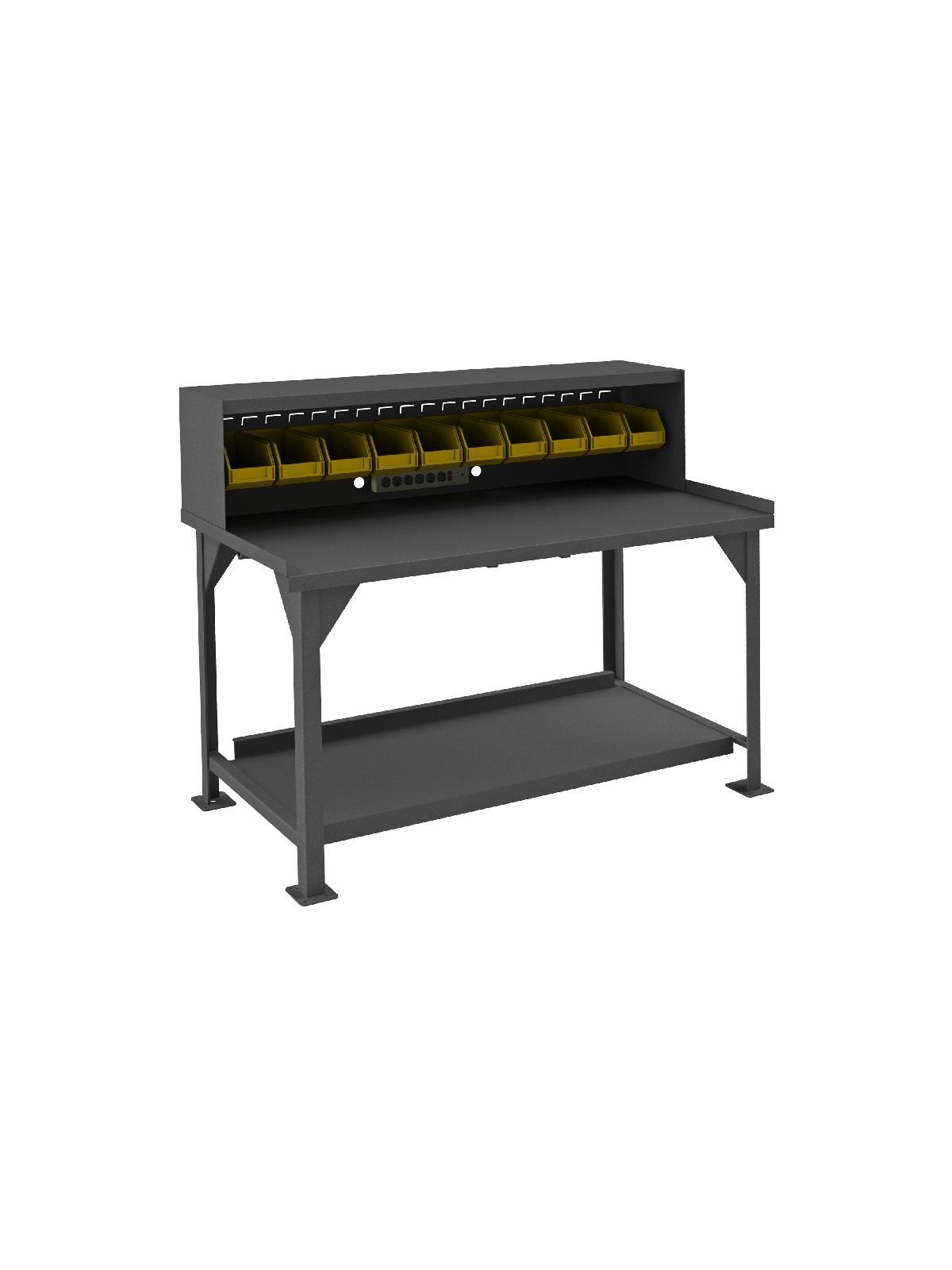 Workbench top is 12 gauge thick reinforced steel. Has angle iron stiffener under work surface and 2" x 2" x 1/4" angle iron legs. Mobile units (DWBM) include (4) 3" phenolic, locking swivel casters. Back and end stops. All units have provisions for optional drawer to be added. Work surfaces are 34" above the floor. All models include a 12 gauge steel lower shelf with 500 lbs. capacity. Foot pads with predrilled holes allow for lagging to the floor. FOB Shipping Point.