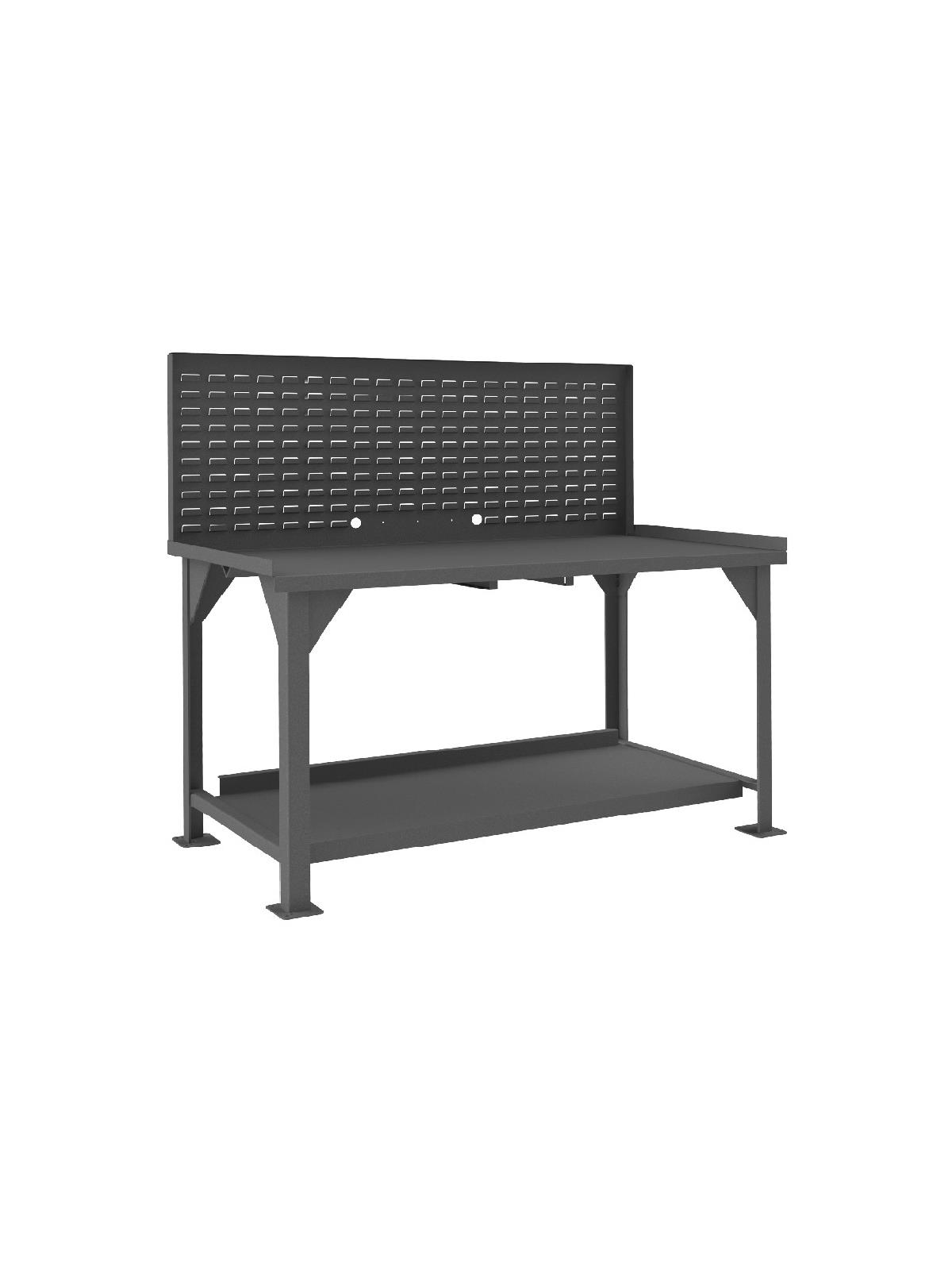 Workbench top is 12 gauge thick reinforced steel. Has angle iron stiffener under work surface and 2" x 2" x 1/4" angle iron legs. Mobile units (DWBM) include (4) 3" phenolic, locking swivel casters. Back and end stops. All units have provisions for optional drawer to be added. Work surfaces are 34" above the floor. All models include a 12 gauge steel lower shelf with 500 lbs. capacity. Foot pads with predrilled holes allow for lagging to the floor. FOB Shipping Point.