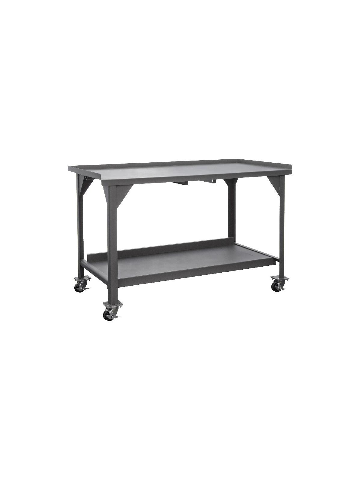 Workbench top is 12 gauge thick reinforced steel. Has angle iron stiffener under work surface and 2" x 2" x 1/4" angle iron legs. Mobile units (DWBM) include (4) 3" phenolic, locking swivel casters. Back and end stops. All units have provisions for optional drawer to be added. Work surfaces are 34" above the floor. All models include a 12 gauge steel lower shelf with 500 lbs. capacity. Foot pads with predrilled holes allow for lagging to the floor. FOB Shipping Point.
