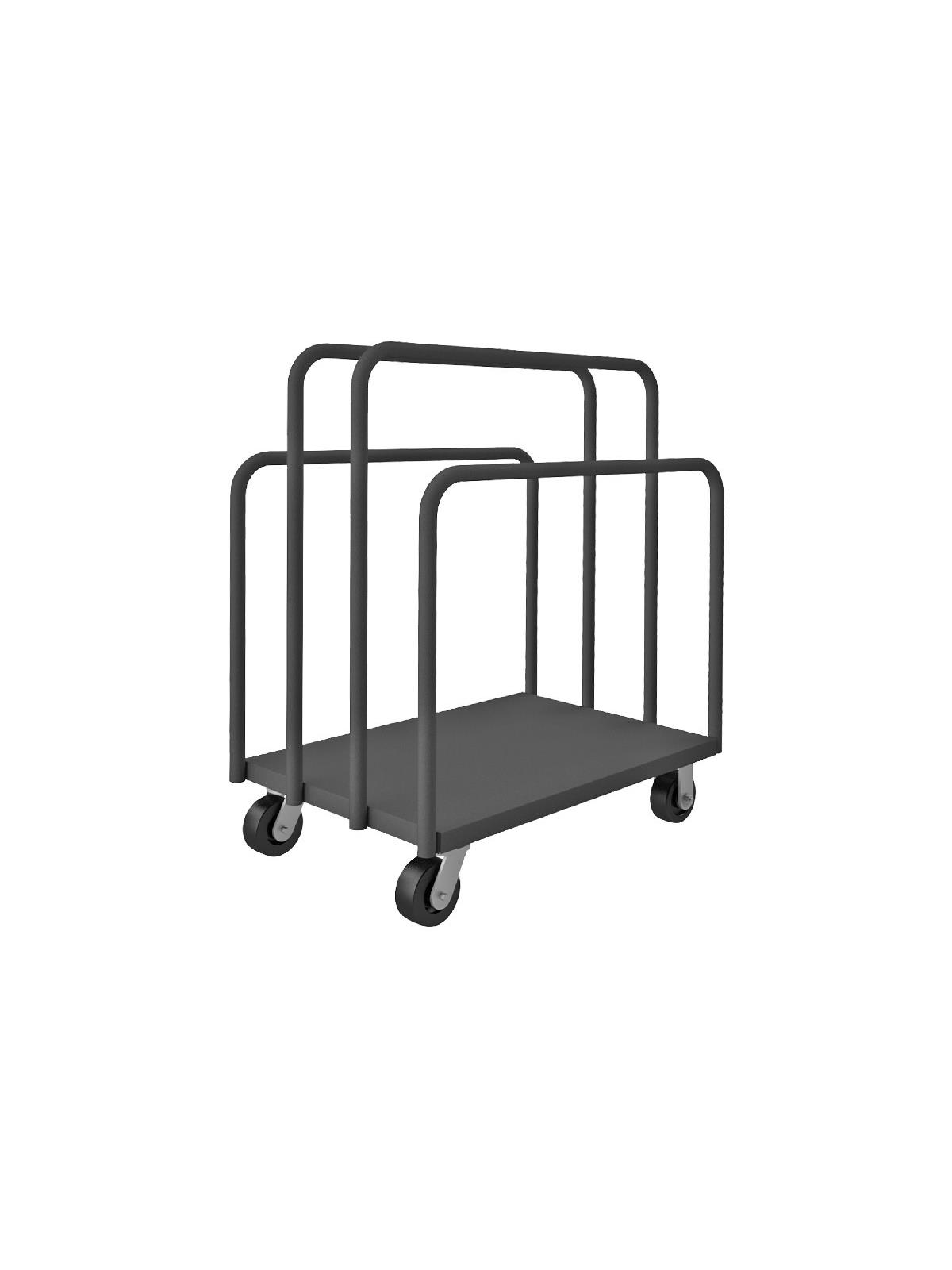 Heavy duty, 14 gauge, steel platform. Easy to access and pick up on-board product. Allows for the storage and transportation of various sizes of panels & products. Durable, gray, textured powder coat finish. FOB Shipping Point.