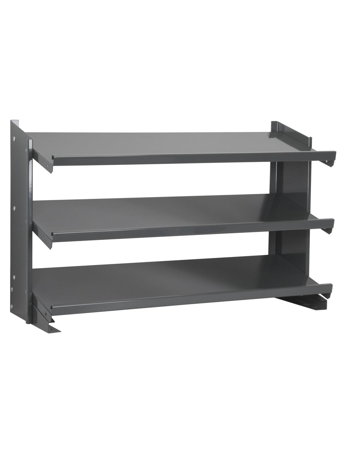 Angled shelves keep small parts in the front of the bins for easy viewing and picking. Convenient heavy-duty storage. Handsome Gray baked-enamel finish. Bins available in Red, Yellow, Blue, Green, or Semi-Clear. FOB Shipping Point.