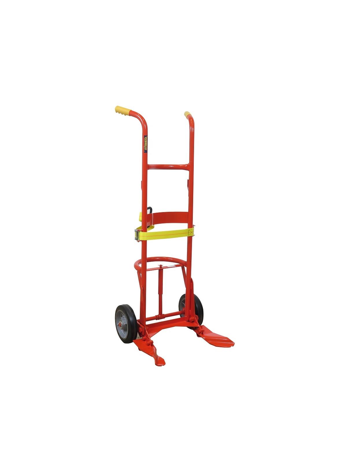 A) Standard Poly Drum Truck Handles all poly and fiber drums except overpacks. Features replaceable "feet" and belt. Wide "feet" and belt eliminate the risk of drums being punctured by nose prongs and chime hooks. Floating axle reduces effort required to break over and balance the load. 23.5"D. Patented design.