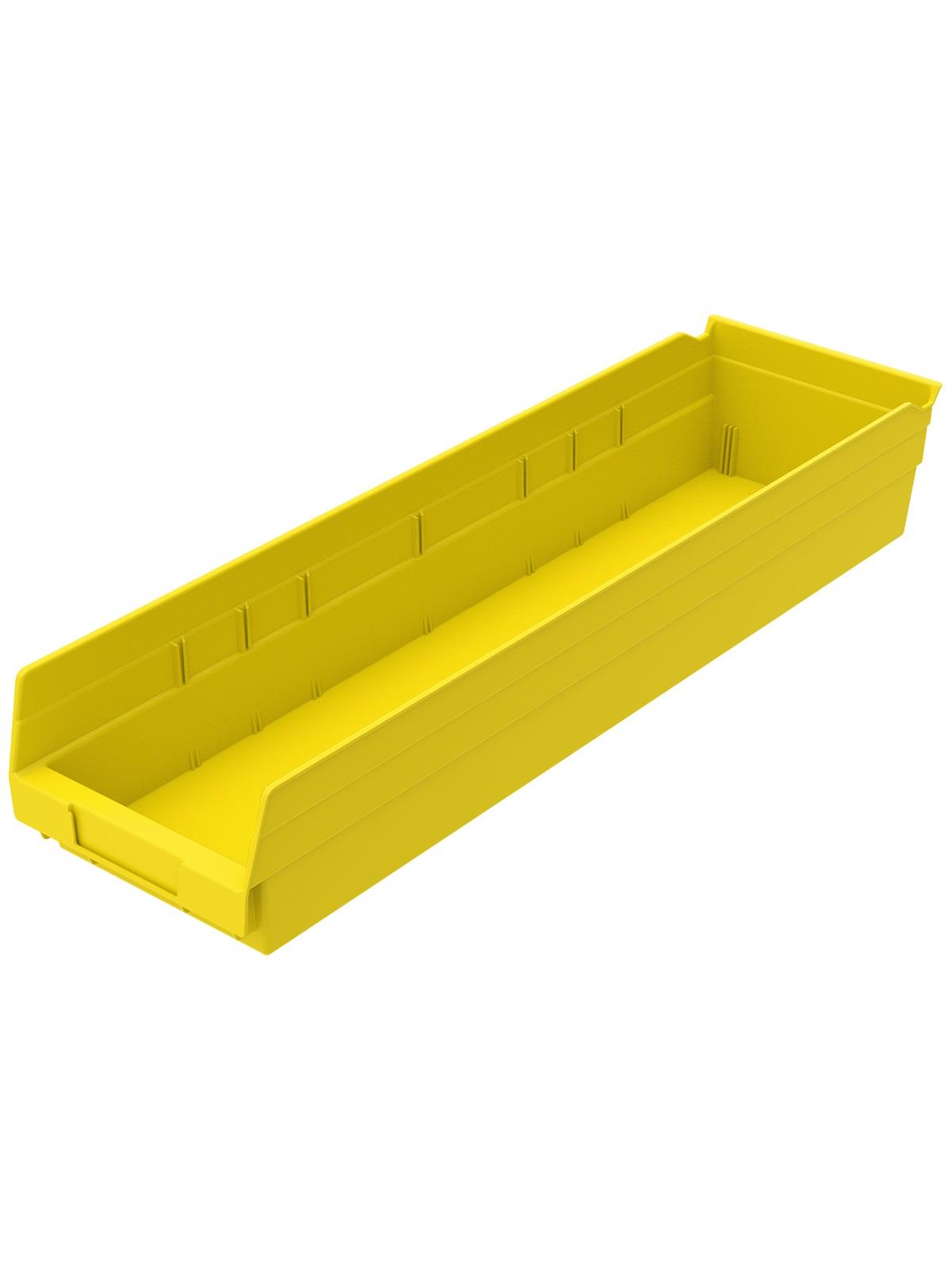 Outlasts corrugated bins - pays for themselves in reduced replacement costs. One-piece construction is waterproof and unaffected by grease or oil. Works with 12", 18" and 24" deep shelving, or vertical storage and retrieval units. Labels available. Available in 22 sizes and five colors - Red, Yellow, Blue, Green, or Semi-Clear. FOB Shipping Point.