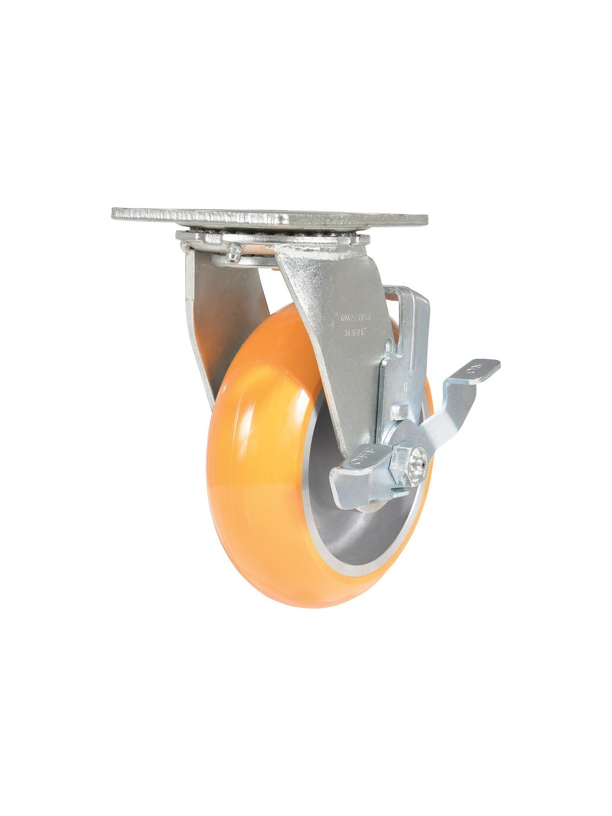 Made of exclusive proprietary donut tread. This caster comes with 6203 precision ball bearings and is bonded to a lightweight water-resistant aluminum core. The high grade elastic polyurethane reduces the force needed for movement and dampens vibrations for a smooth quiet roll. It also deflects debris, which strengthens its longevity and durability. Top plate size 4" x 4-1/2". FOB Shipping Point.