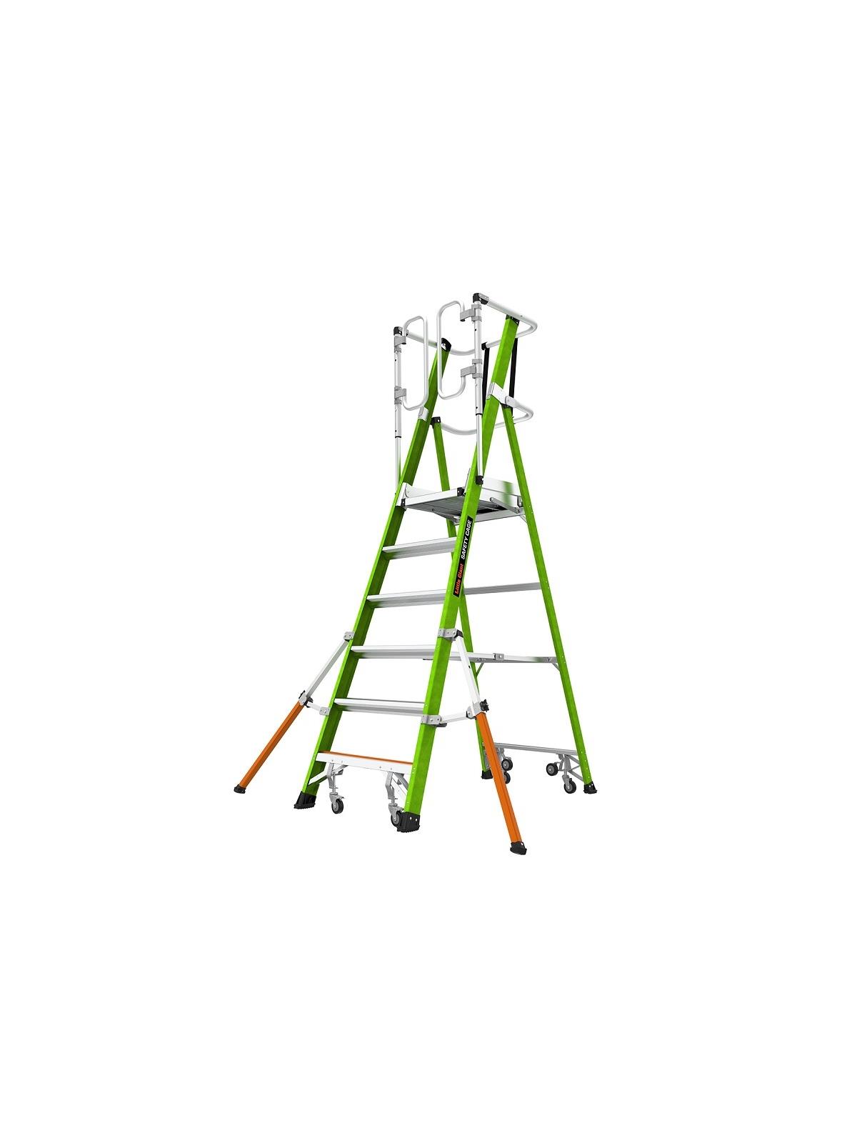 Constructed from a non-conductive fiberglass-resin composite, the Safety Cage folds compactly, making it easy to store. The Safety Cage can be set up with just one person. Descend the ladder with confidence knowing you will never miss the bottom rung again with the Ground Cue®. The Ground Cue alerts you with an audible "click" when you've reached the last rung on the ladder. The Safety Cage meets or exceeds all OSHA and ANSI standards and is rated IAA to hold 375 lbs. It is available in 4, 6, 8 and 10-foot sizes (platform heights of 2, 4, 6 and 8 feet respectively). FOB Shipping Point.
