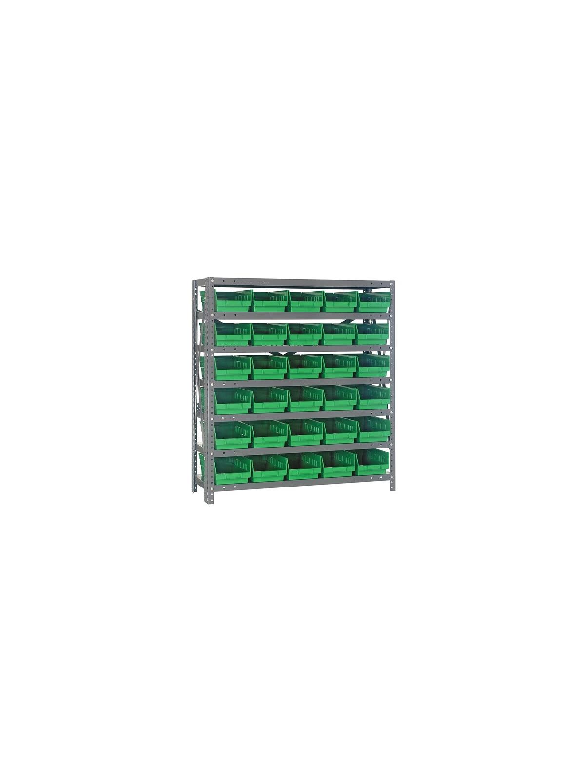 Rugged 350 lb. capacity per shelf, standard shelving unit will keep parts organized and readily accessible. Gray enamel finish will not rust or corrode. 12-HQSB100, 8-HQSB101, 5-HQSB102, 4-HQSB107, 3-HQSB109 fit across a standard 36"W x 12"D shelf. 8-HQSB103, 5-HQSB104, 4-HQSB108, 3-HQSB110 fit across a 36"W x 18"D shelf. Bins are available in Blue, Yellow, Red, Green, Ivory or Black. FOB Shipping Point.