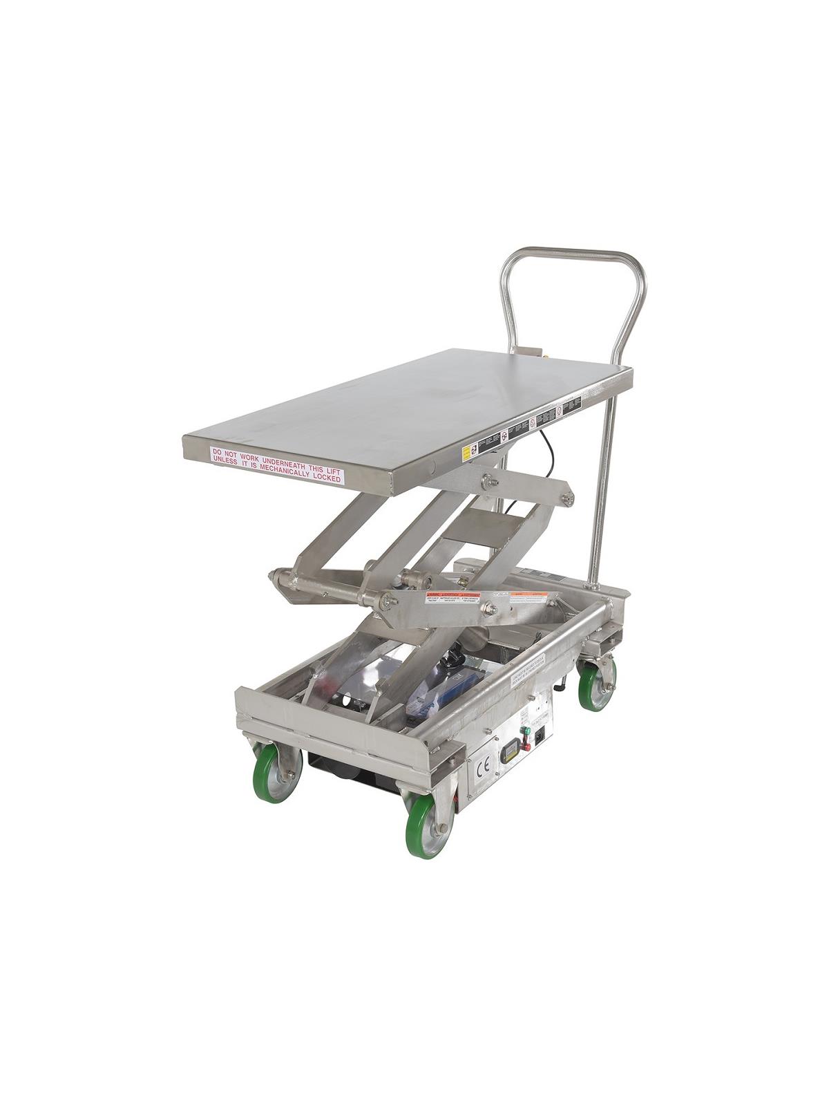 Our fully welded stainless steel carts resist corrosion and wet environments. -SS3 Models are made of 316 Stainless Steel. All parts on the -SS & the -SS2 models are made from 304 grade stainless steel, including the hydraulic pump and foot pedal. These carts are suitable for most food, medical, and pharmaceutical industry settings. Also suitable for wash-down applications. 2 rigid and 2 swivel polyurethane wheels with brakes standard.  FOB Shipping Point.