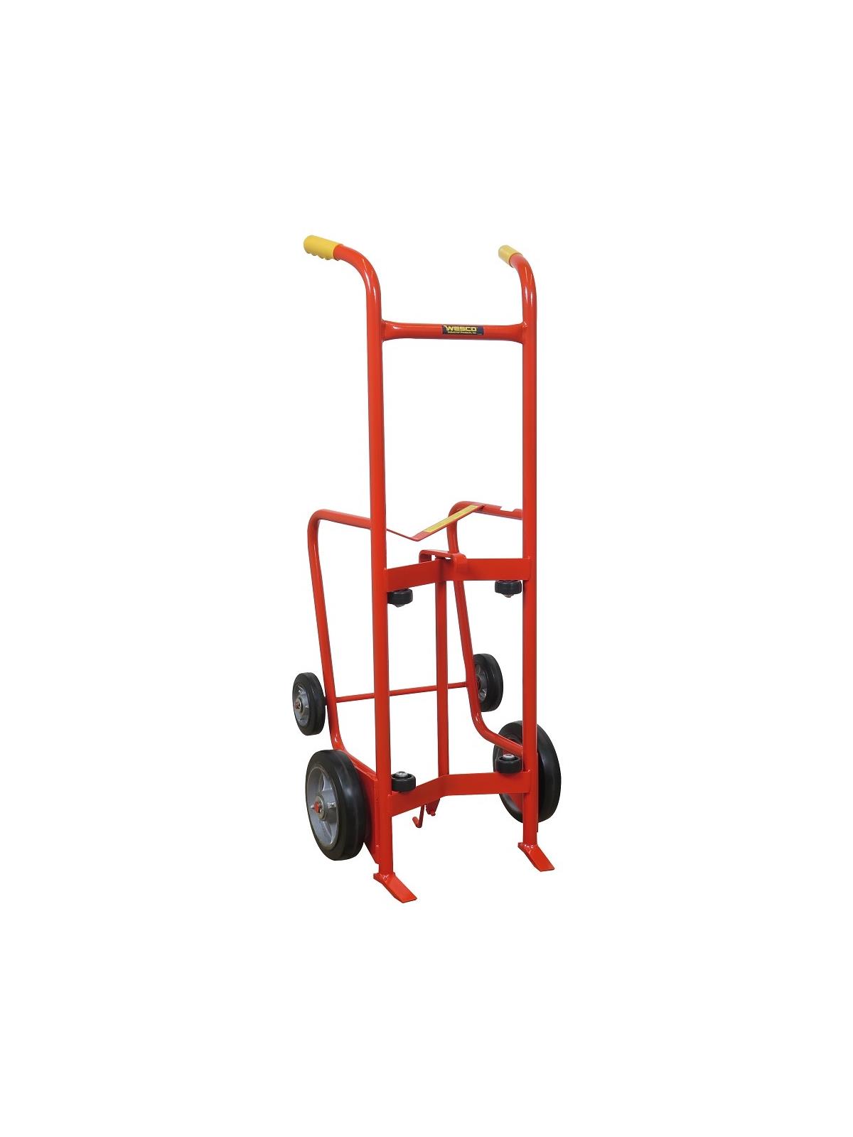 Machined steel load wheels behind nose prong help ease the lifting of drum. Classic single bar frame design. Kickstand. 24"W. at handle. 16.25"W. at nose.