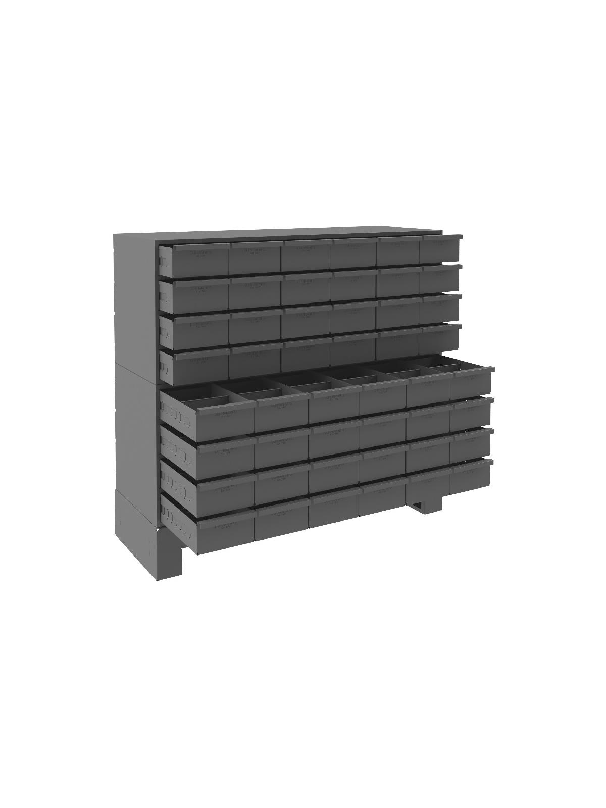 Full-width handle drawers open easily thanks to two embossed runners.  Positive stop prevents spilling. Each drawer comes with 2 dividers. Shipped assembled. Includes base. Gray powder coat finish. FOB Shipping Point.