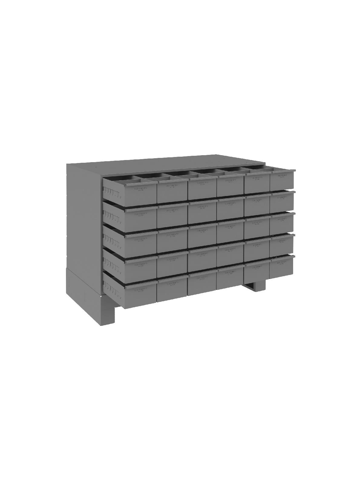Full-width handle drawers open easily thanks to two embossed runners.  Positive stop prevents spilling. Each drawer comes with 2 dividers. Shipped assembled. Includes base. Gray powder coat finish. FOB Shipping Point.
