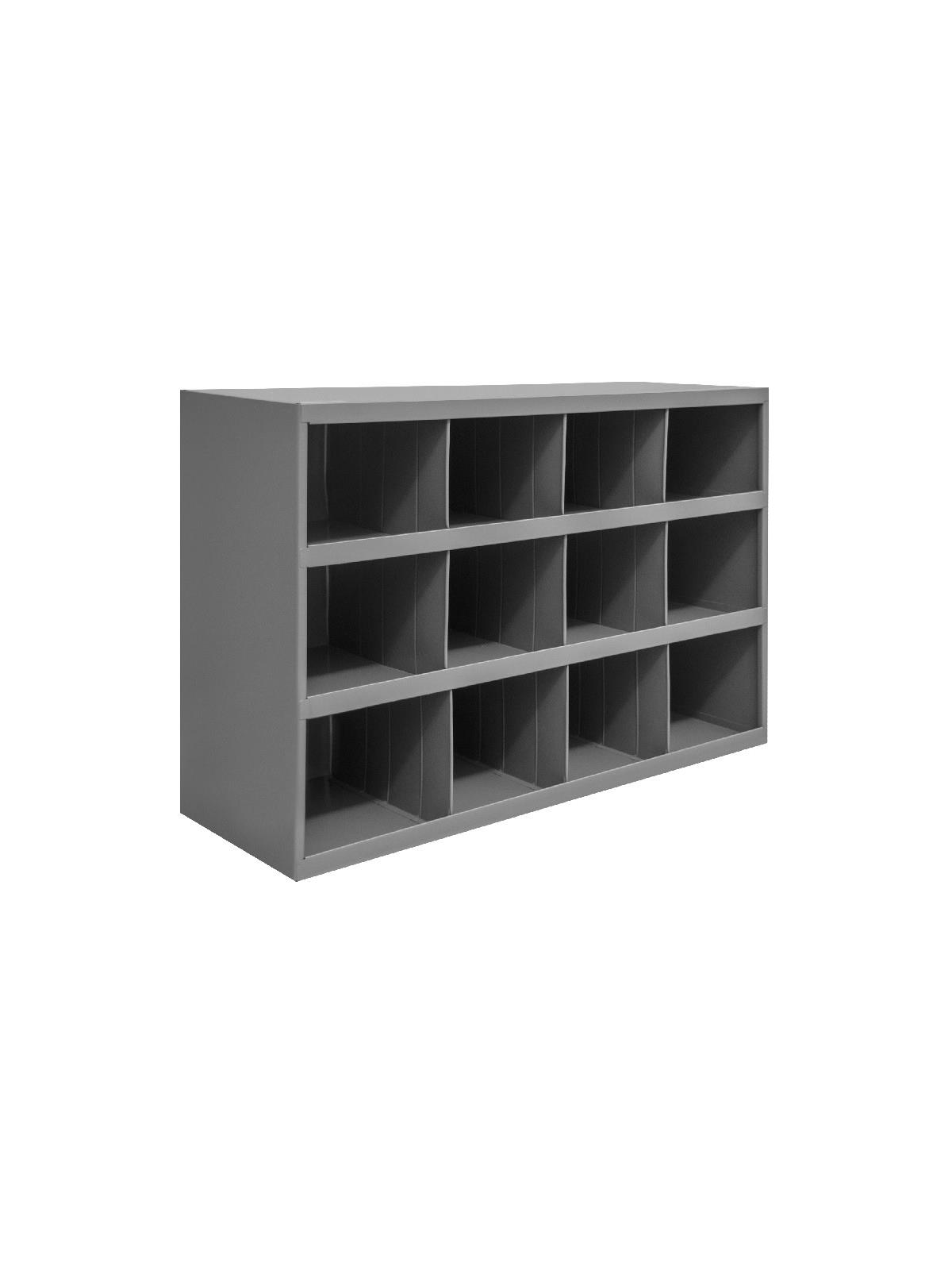 Roll-formed sides for increased strength and stability. Newly redesigned slope shelves. Ribbed and hemmed dividers provide added strength. Optional base available. Ships fully assembled ready for use. Durable gray powder coat finish. FOB Shipping Point.