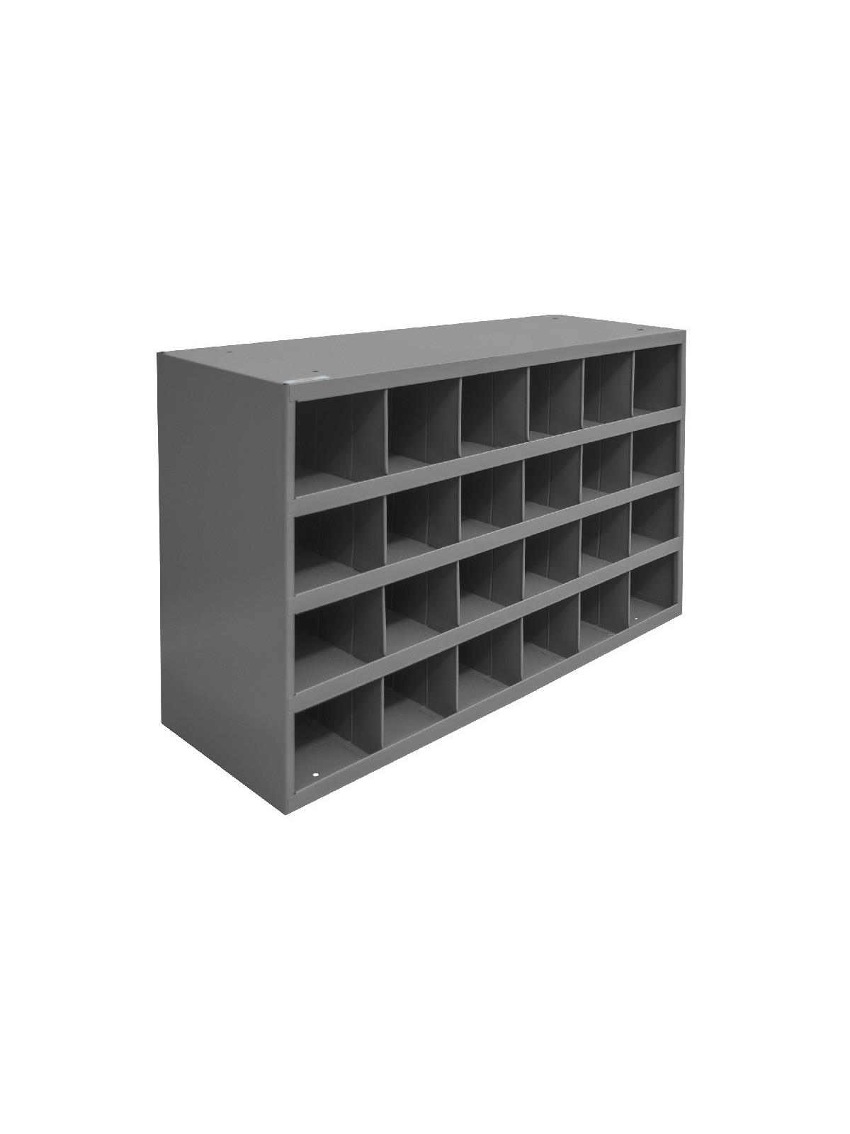 Roll-formed sides for increased strength and stability. Newly redesigned slope shelves. Ribbed and hemmed dividers provide added strength. Optional base available. Ships fully assembled ready for use. Durable gray powder coat finish. FOB Shipping Point.