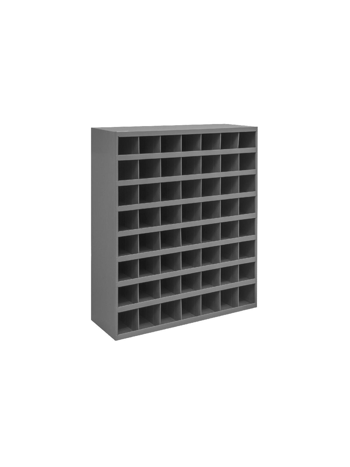 Roll-formed sides for increased strength and stability. Newly redesigned slope shelves. Ribbed and hemmed dividers provide added strength. Optional base available. Ships fully assembled ready for use. Durable gray powder coat finish. FOB Shipping Point.