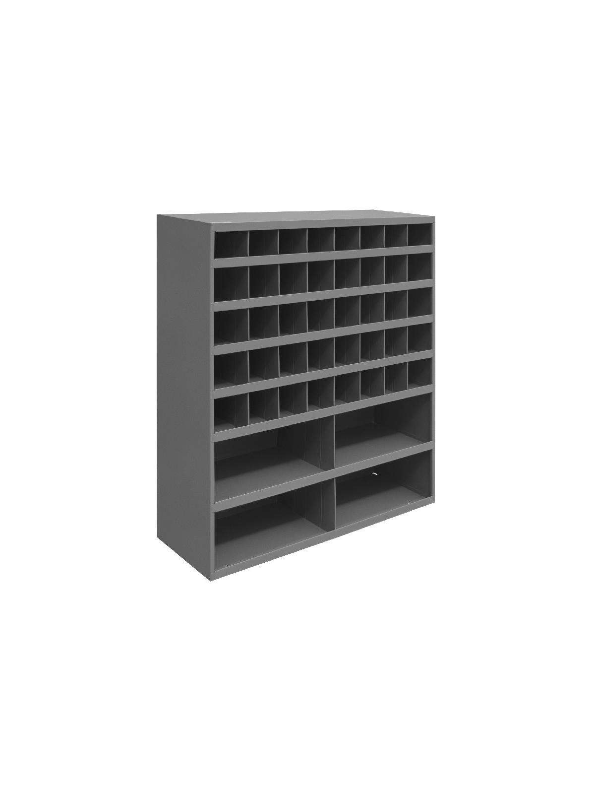 Roll-formed sides for increased strength and stability. Newly redesigned slope shelves. Ribbed and hemmed dividers provide added strength. Optional base available. Ships fully assembled ready for use. Durable gray powder coat finish. FOB Shipping Point.