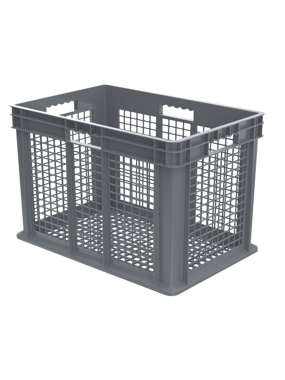 These straight wall containers have smooth inner walls that make cleaning easy and sanitary. The mesh sides allow excellent hot or cold air ventilation. Manufactured from injection-molded high-density polyethylene. Available in 4 sizes and 3 styles. Gray in color. FOB Shipping Point.