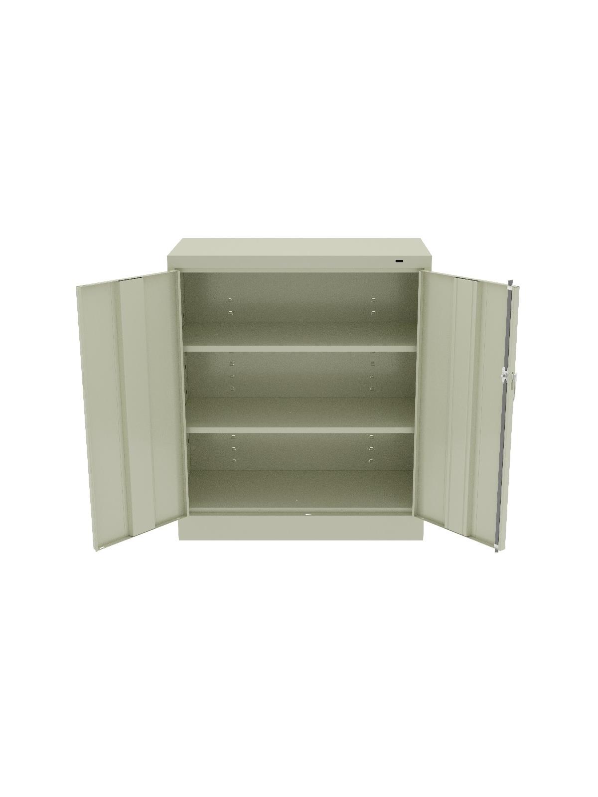 Knuckle hinges on each door insure the integrity of the cabinet and the alignment of the doors. Doors are reinforced for strength and quietness. Handle on right-hand door activates a 3-point system for added security; dummy handle on left-hand door. Shelves are adjustable in 2" increments on built-in shelf tabs. Shelves will hold up to 200 lbs. evenly distributed. Two front leveling glides compensate for uneven floors. Louvered back panel allows air circulation in the cabinet. Available in four models--storage, wardrobe, combination, and counter high cabinets. Available in Black, Champagne/Putty, Sand, Light Gray and Medium Gray. FOB Shipping Point.