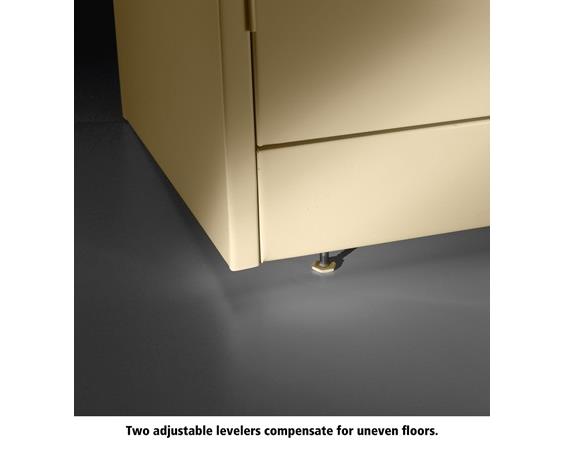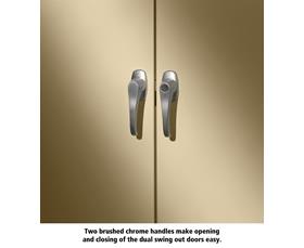 Knuckle hinges on each door insure the integrity of the cabinet and the alignment of the doors. Doors are reinforced for strength and quietness. Handle on right-hand door activates a 3-point system for added security; dummy handle on left-hand door. Shelves are adjustable in 2" increments on built-in shelf tabs. Shelves will hold up to 200 lbs. evenly distributed. Two front leveling glides compensate for uneven floors. Louvered back panel allows air circulation in the cabinet. Available in four models--storage, wardrobe, combination, and counter high cabinets. Available in Black, Champagne/Putty, Sand, Light Gray and Medium Gray. FOB Shipping Point.
