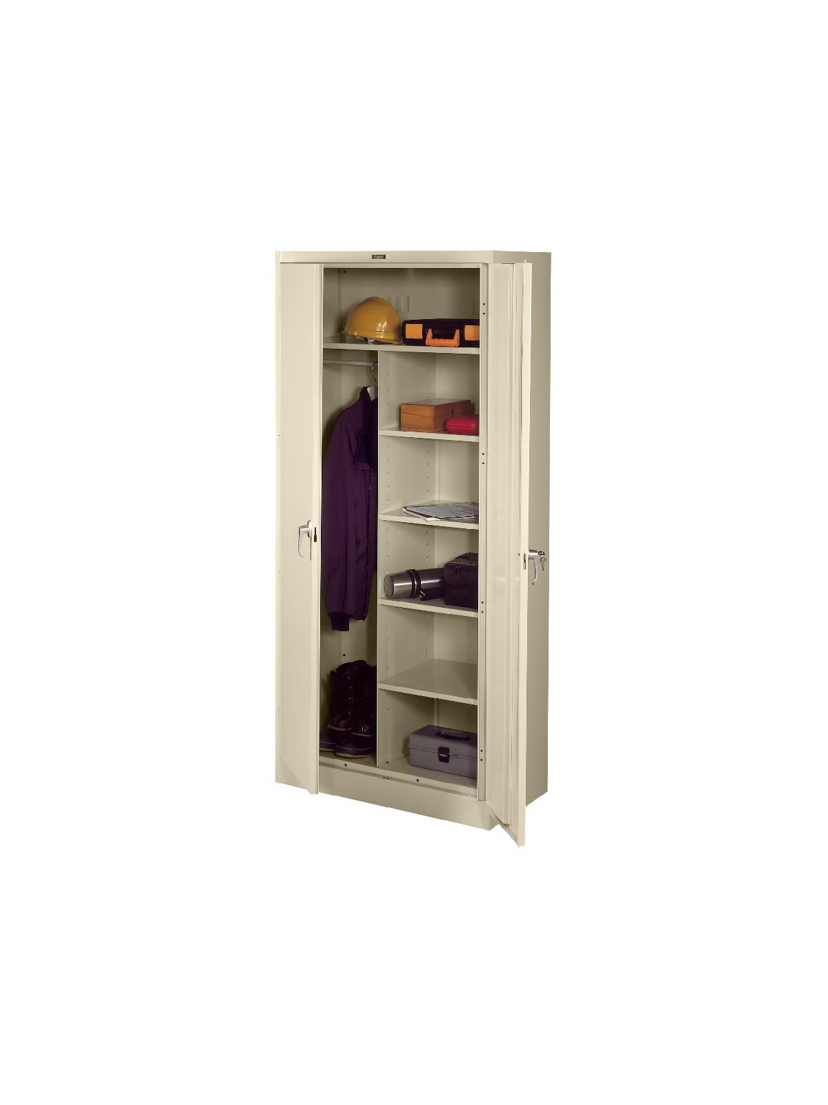 Knuckle hinges on each door insure the integrity of the cabinet and the alignment of the doors. Doors are reinforced for strength and quietness. Handle on right-hand door activates a 3-point system for added security; dummy handle on left-hand door. Shelves are adjustable in 2" increments on built-in shelf tabs. Shelves will hold up to 200 lbs. evenly distributed. Two front leveling glides compensate for uneven floors. Louvered back panel allows air circulation in the cabinet. Available in four models--storage, wardrobe, combination, and counter high cabinets. Available in Black, Champagne/Putty, Sand, Light Gray and Medium Gray. FOB Shipping Point.