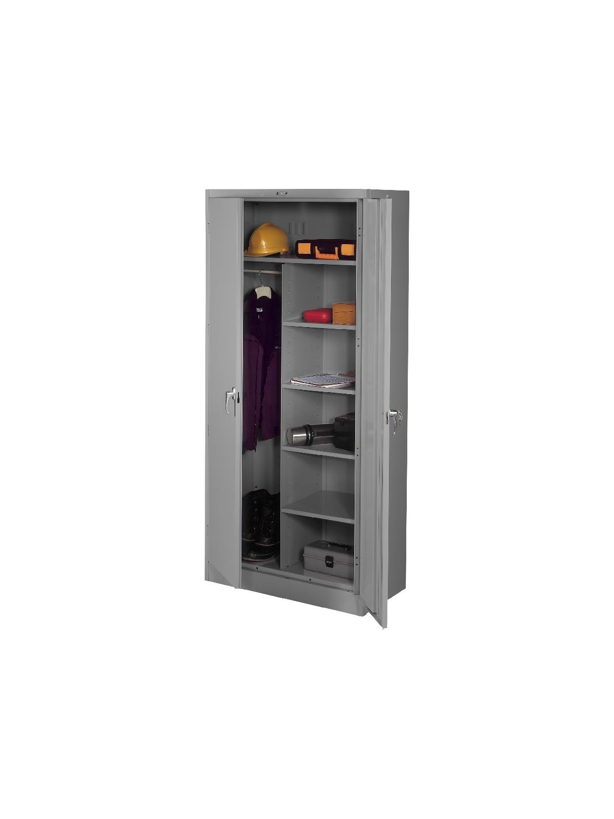 Knuckle hinges on each door insure the integrity of the cabinet and the alignment of the doors. Doors are reinforced for strength and quietness. Handle on right-hand door activates a 3-point system for added security; dummy handle on left-hand door. Shelves are adjustable in 2" increments on built-in shelf tabs. Shelves will hold up to 200 lbs. evenly distributed. Two front leveling glides compensate for uneven floors. Louvered back panel allows air circulation in the cabinet. Available in four models--storage, wardrobe, combination, and counter high cabinets. Available in Black, Champagne/Putty, Sand, Light Gray and Medium Gray. FOB Shipping Point.