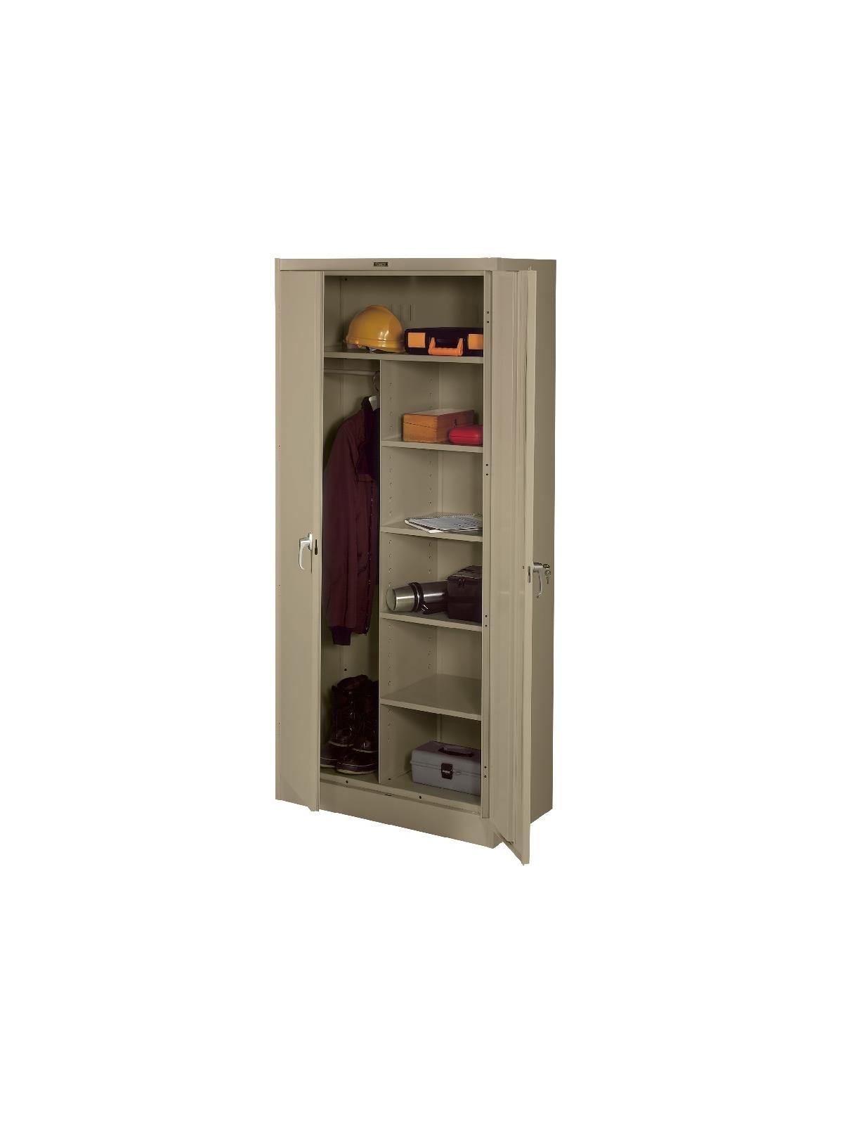 Knuckle hinges on each door insure the integrity of the cabinet and the alignment of the doors. Doors are reinforced for strength and quietness. Handle on right-hand door activates a 3-point system for added security; dummy handle on left-hand door. Shelves are adjustable in 2" increments on built-in shelf tabs. Shelves will hold up to 200 lbs. evenly distributed. Two front leveling glides compensate for uneven floors. Louvered back panel allows air circulation in the cabinet. Available in four models--storage, wardrobe, combination, and counter high cabinets. Available in Black, Champagne/Putty, Sand, Light Gray and Medium Gray. FOB Shipping Point.