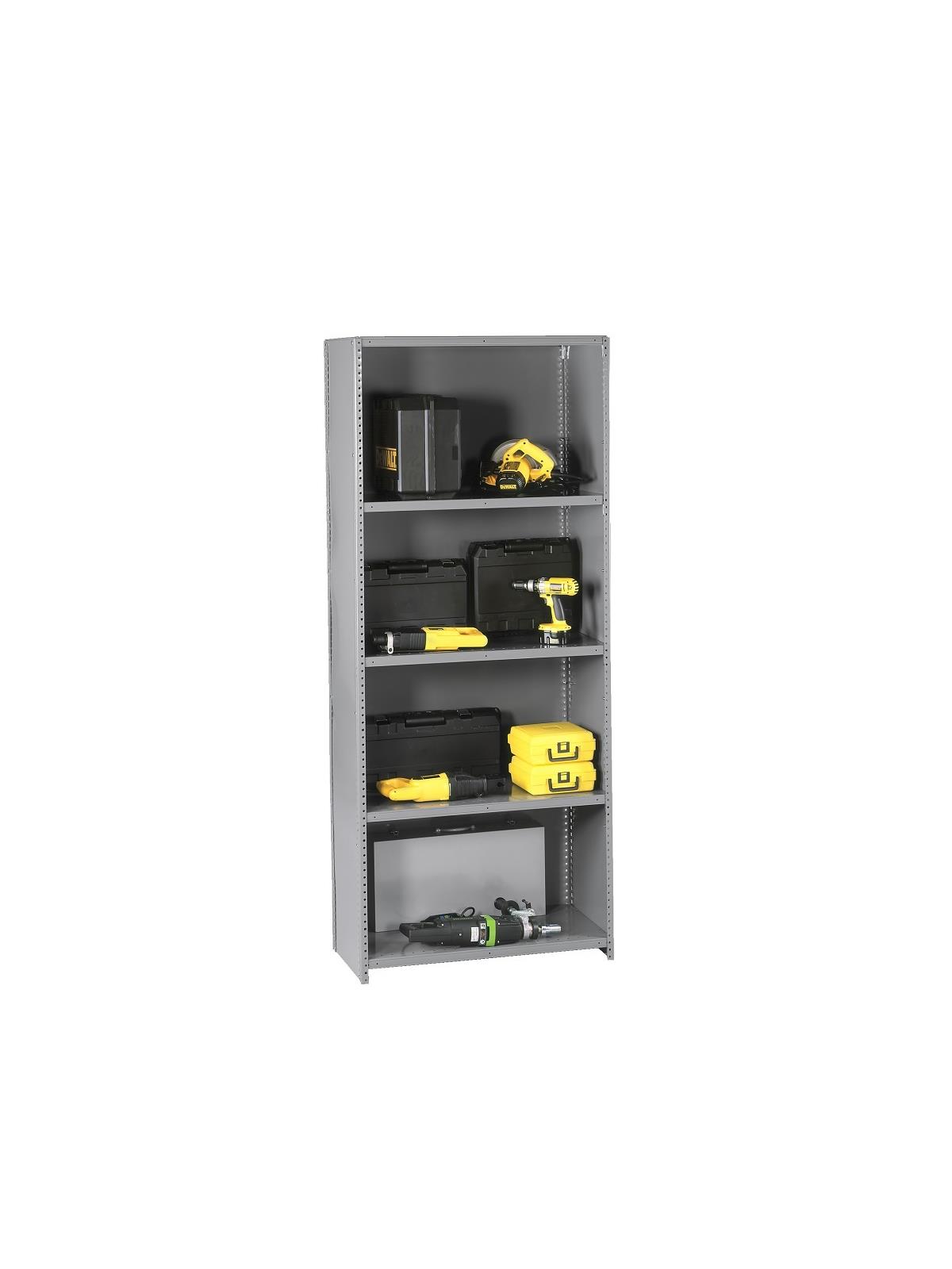 The unique shelf design has deep box-beam formations front and back, fully lapped and welded corners and double-ribbed outside surfaces on the box formation. In addition, the front and rear flange on the box beam is welded every 3". The result is load capacities that range all the way up to 1000 lbs. Shelves can be adjusted quickly and easily in 1" increments to make maximum use of vertical space. Five shelves including top and bottom shelves. Choose from open or closed units. Additional shelves are available as well as adjustable shelf dividers, shelf boxes and doors. Starter unit can be used individually or combined with adder units to form a row of shelving. Shipped unassembled. Medium gray finish. FOB Shipping Point.