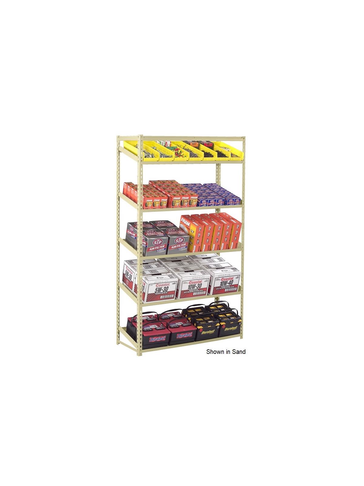 Parts, bins and boxes slide forward for easy picking. Open access from all sides. Place back to back to double shelf depth. Canopy top has box formed construction. Features 2" side flange to retain product. 1/2" front lip acts as a product stop. Heavy gauge shelf supports. Shelves support up to 450 lb. loads. Boltless construction - easy assembly with only a mallet. 5 sloping steel shelves per unit. 18"D. shelves slope 12 degrees. 24"D. shelves slope 14 degrees. Starter unit can be used individually or combined with adder units to form a row of shelving. Medium Gray or Sand finish. FOB Shipping Point.