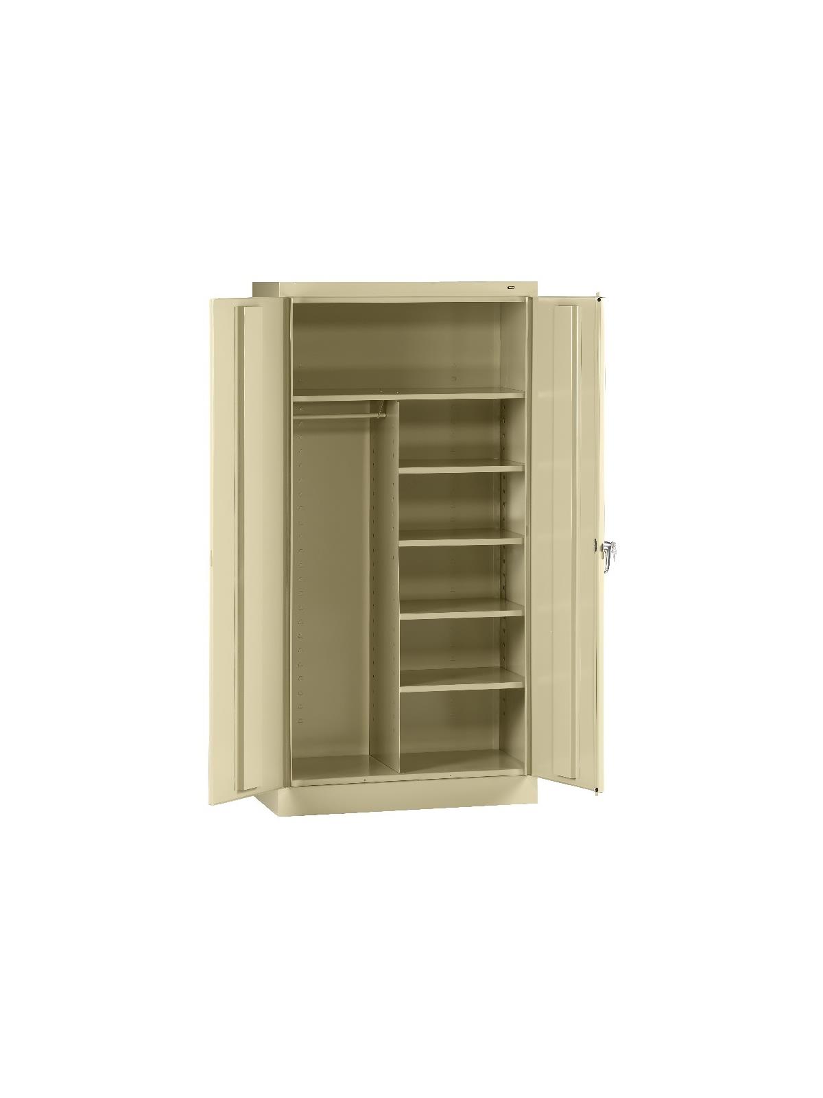 Shelves adjust in 2" increments. Heavy-steel construction with leaf hinges and reinforced doors stand up to a lifetime of heavy use. Handle on right-hand door activates the three-point locking system to keep belongings secure. Raised base keeps contents from contacting moisture from the floor. Available in 3 models--storage, wardrobe and combination. Available in Black, Champagne/Putty, Sand, Light Gray and Medium Gray. FOB Shipping Point.