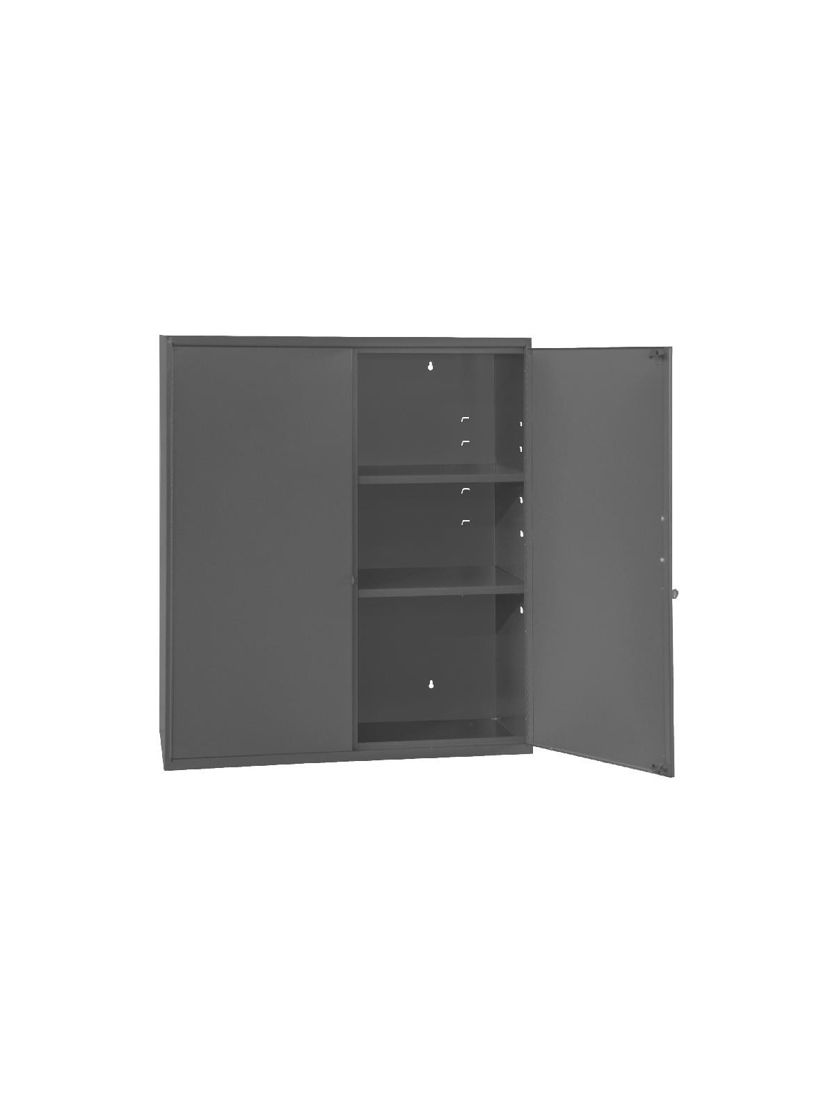 All-welded steel construction prevents warping and twisting. Full piano hinges prevent doors from sagging. Key hole slots in back of unit for wall mounting. Durable, gray, powder coat finish. FOB Shipping Point.