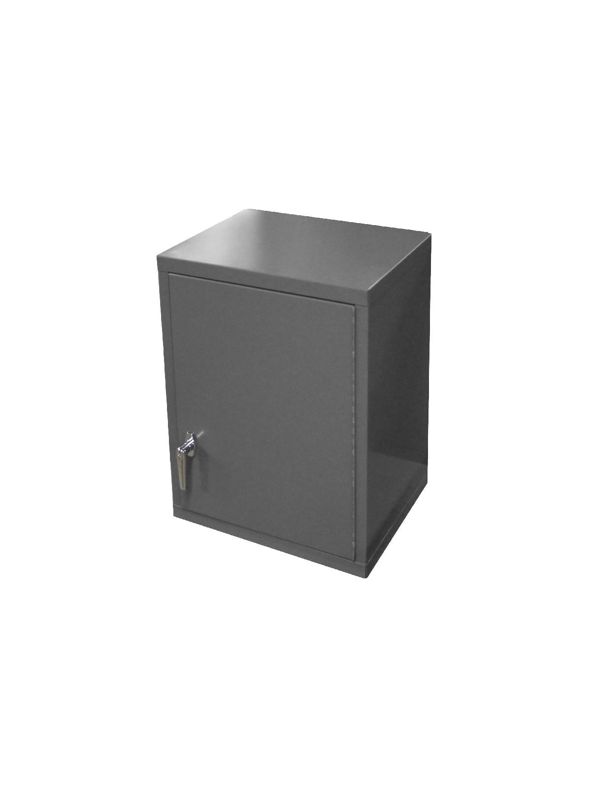 18 gauge, all welded, steel construction. Includes mounting hardware. Includes 2 adjustable shelves that adjust on 2" centers. Locking system with keys included. Keyhole slots in the back of the unit for wall mounting. Ships fully assembled. Gray, gloss powder coat finish. FOB Shipping Point.