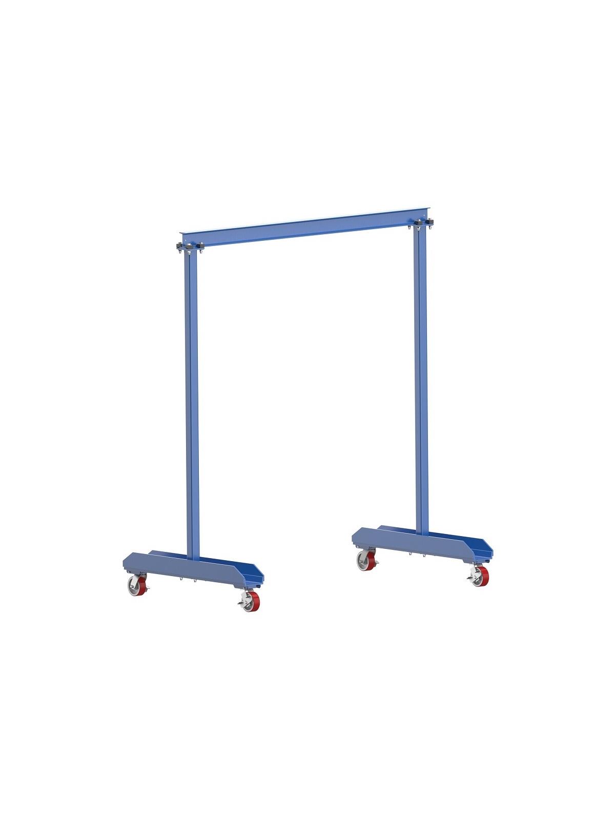 Lightweight fixed height design allows for easy mobility. Includes (4) 5" x 2" poly-on-steel swivel casters with brake. Overall I-beam length is 79-3/4". Do not move units while loaded. Steel construction with blue baked in powder coat finish for added toughness. Bolt together installation. Hoist and trolley sold separately. FOB Shipping Point.