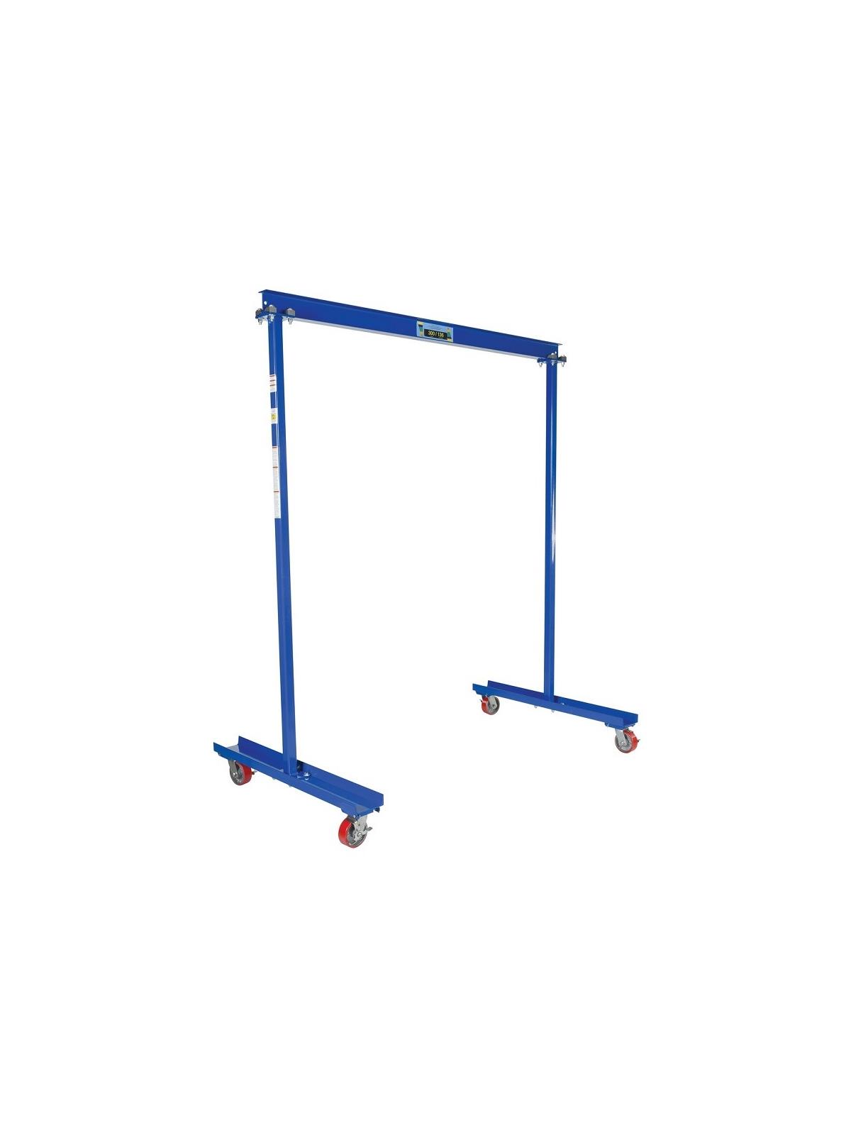 Lightweight fixed height design allows for easy mobility. Includes (4) 5" x 2" poly-on-steel swivel casters with brake. Overall I-beam length is 79-3/4". Do not move units while loaded. Steel construction with blue baked in powder coat finish for added toughness. Bolt together installation. Hoist and trolley sold separately. FOB Shipping Point.