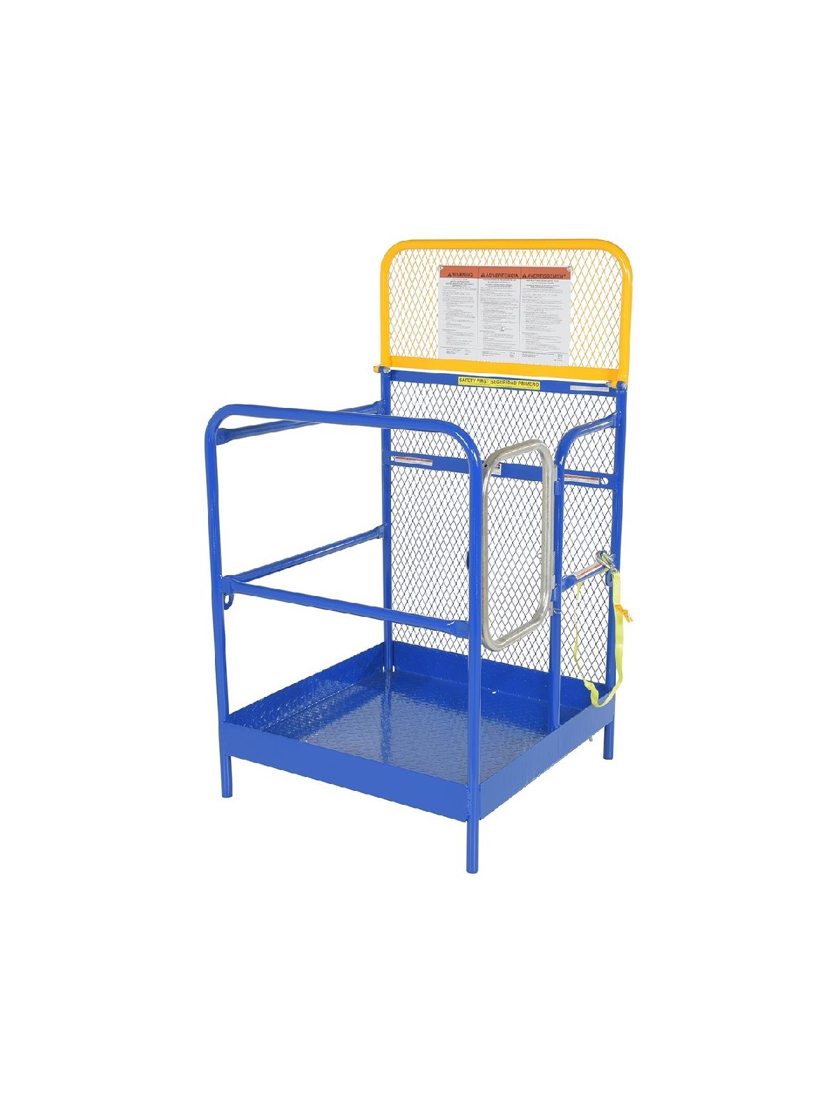 Convenient fork truck work platforms quickly and safely raise maintenance personnel where they are needed. Attaches to fork lift truck by inserting forks into fork pockets and securing platform to fork truck. Fork locks secure platform to forks and a 36" long safety restraint which hook attaches platform to fork truck. 42" high handrail with 21" high mid-rail on three sides. 60" high expanded metal backing on forth side (84" high backing to meet California OSHA available, call for details). Includes diamond plate platform. The usable fork pockets on single and dual side door entry are 7-3/4"W x 3-7/8"H in rear and 7-3/4"W x 1-7/8"H in front. The usable fork pockets on fold down work platform measure 7-7/8"W x 3-3/8"H on 27-3/4" centers. Steel construction with baked-in powder-coated toughness. FOB Shipping Point.
