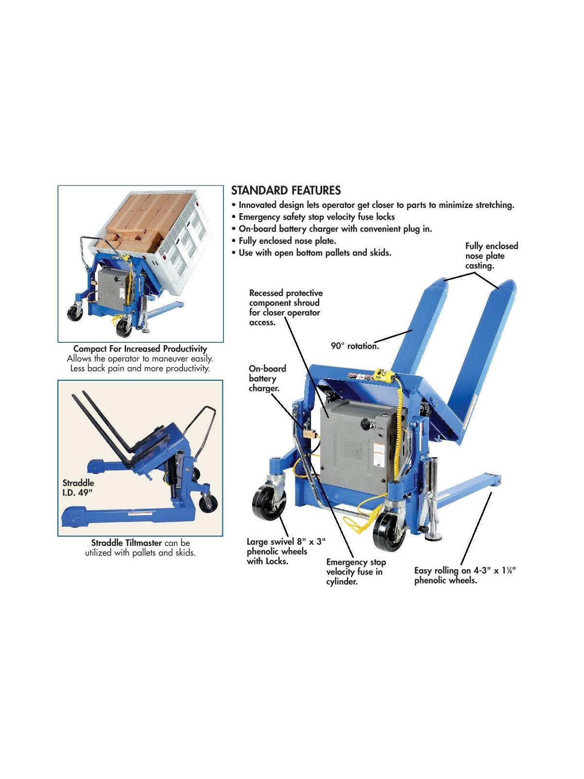Lift and position filled tote boxes or baskets without the need of a fork truck or lift table using the newly designed heavy-duty Tilt Master. These 90 degree tilters will function as a transporter by moving completed products from work station to work station without waiting for a fork truck. A folding ergonomic handle has dual steering grips for quick and easy maneuverability. Unit has a thin profile to allow the user to get as close to the load as possible. Units roll easily on 8" x 3" phenolic steering wheels and feature a floor lock. Series TM are to be used with open bottom pallets or skids only while the Tilt Master Straddle units, series TMS, can be used with virtually any kind of container or pallet. Units are powered with a 12V DC electric motor including an on-board battery charger standard. AC or *AIR/OIL power units available contact factory (*filter - regulator - lubricator required). Comes standard with a push-button hand control on an 8 foot coil cord. Battery Charge Indicator Gauge now standard. FOB Shipping Point.