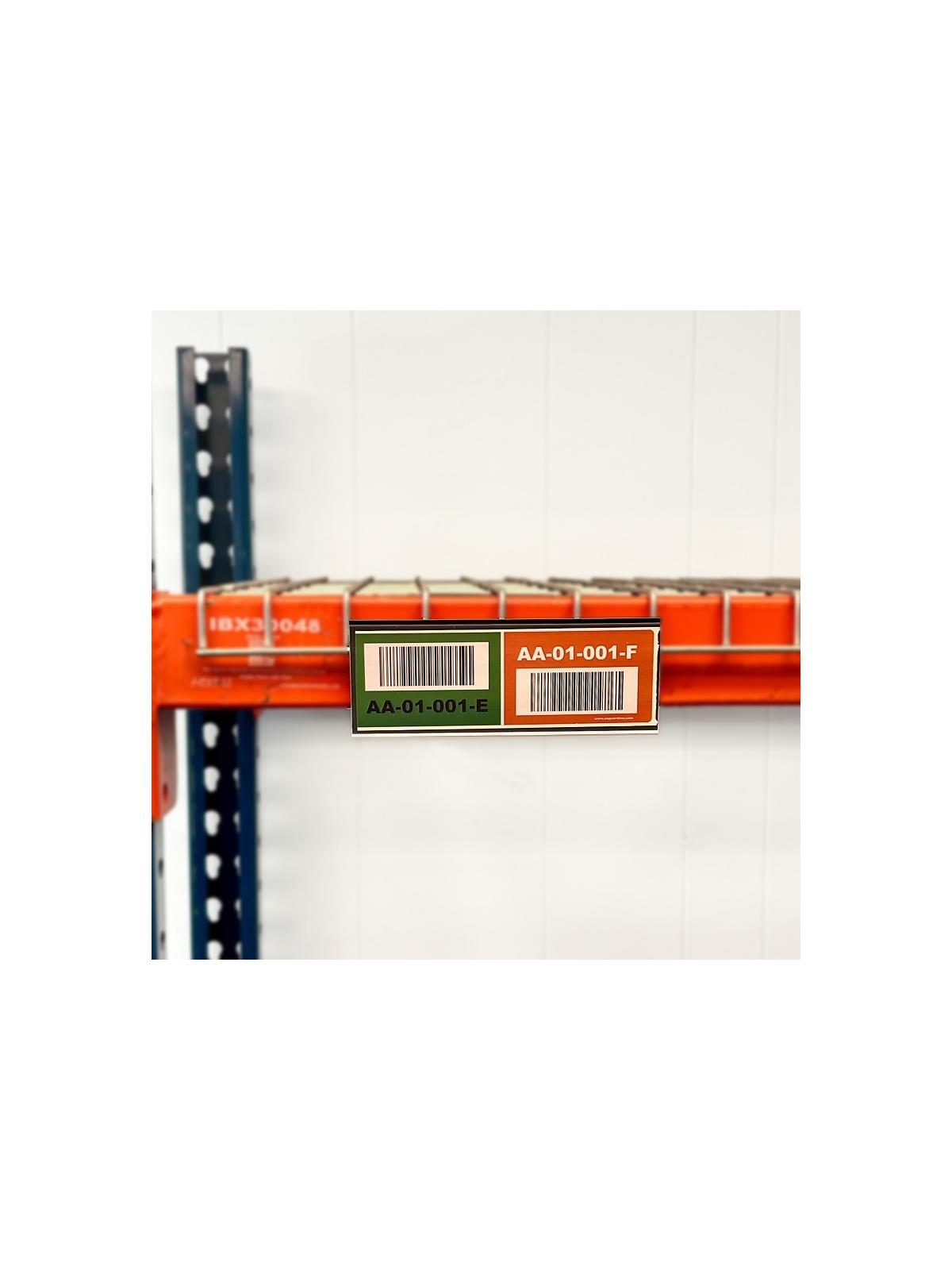 Clear front and gray background for maximum visibility. Fits all standard waterfall wire decking with 2" centers and 1/4" dia. wire. Ideal for all warehouses in normal or cold storage environments (to -20°F). Easily add signage or labels to your pallet racking when utilizing wire decking. Bar Code compatible, 25 per package. White Laser Inserts included. FOB Shipping Point.